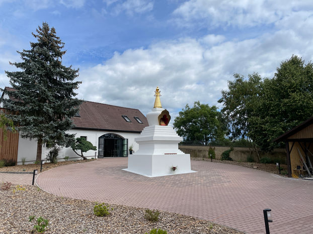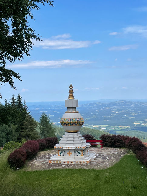 The Enlightenment Stupa is located on the grounds of the KARMA KUNGHA PADKAR LING meditation, relaxation and healing centre. Symbolizes Buddha's enlightenment under the Bodhi tree. Preparations for its construction began in early 2024 and was completed the same year under the guidance of Maniwa Sherab Gyaltsen Rinpoche. The inauguration took place on September 11, 2024. The centre itself is still under construction, but visitors will be allowed access to the stupa. Precious Buddhist relics were used in the construction include relics of Buddha Shakyamuni. Its parts are made of artificial stone specially created to ensure the durability of the stupa.
